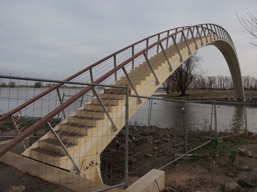 今年の正月に強行したオランダ紀行では、ナイメーヘンという街に一泊した。翌朝はとりあえずこの街のシンボル的橋梁であるWaalbrugを見に行ったのだが、その近くに架かっている歩道橋を目ざとく見つけ、思わず駆け寄った。 ワンスパンのアーチリブに階段が設…