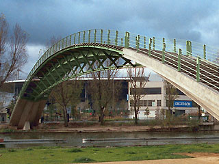 2008-12-15 構造デザイン的アプローチ ペデ 構造 パリ市内の運河に架かる歩道橋。テンションメンバーによってアーチを描く薄い桁を補剛している。プレファブの鋼桁部を船で運び、コンクリートの脚部に落とし込むという方法によって、極めて短期間に施工したとのこと。 以前、設計者のマルク・ミムラム氏にお話を伺う機会があった。その中で氏は、この橋の構造設計を「純粋な幾何学的ゲームで解決した」と語っていた。構造性や施工性を高い次元で満足しつつ華麗な外観を得たこの橋のコンセプトは、いわゆる構造デザインということなんだろうね。