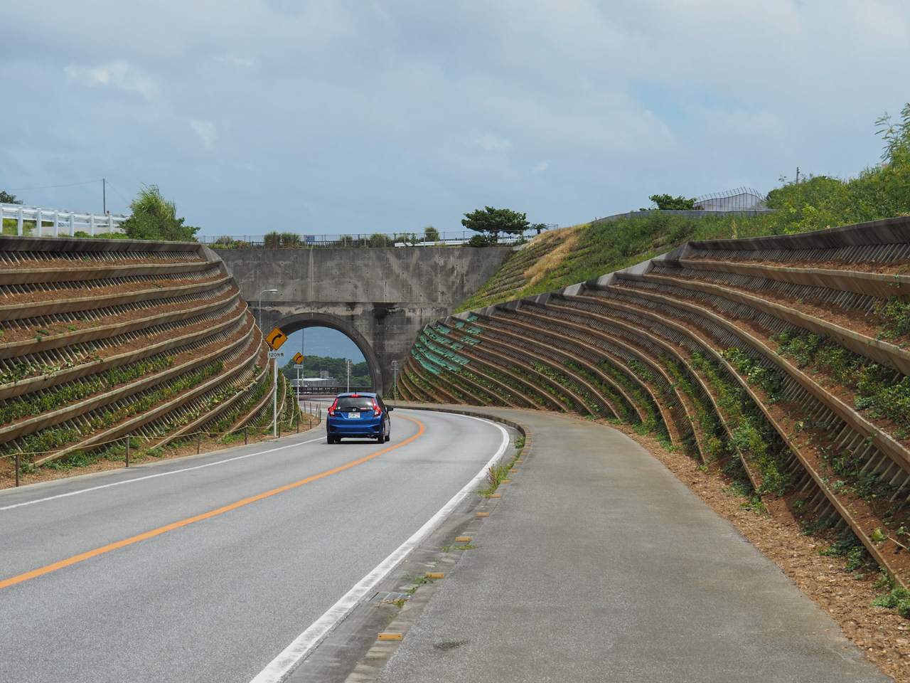 もちろんその眺望にも感激したのだけど、侮れないのが道路の走行景観。アプローチ部分は緑の生育状態がいまひとつなプレキャスト緑化ブロックの水平ラインにより道路線形が強調されている。正面は通路のための壁面があるため見通しが効かない。この閉塞感や人工感が高まったところでトンネルを抜けると、青い海への眺望が一気に広がるとともに、爽快な気分で樹林の上空を飛ぶように走るってわけだ。