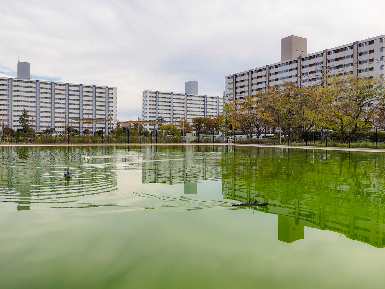 埋立地にずらりと並ぶ巨大団地と、豪雨で増水した夏は透明だったであろう緑色のプール。その水面にはラジコンの船が悠々と走っている。なんともシュールなシーンだが、いろんな思いを巡らせることができる、実に深みがある風景なのだ。