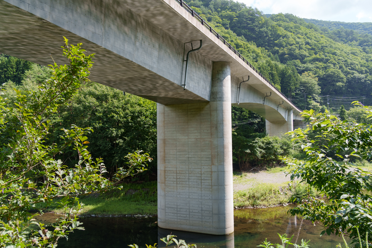 湯西川ダムによる湯西川湖の最上流部に、「仲内大橋」というPCラーメン橋がひっそりと架かっている。小判型橋脚とウェブが少し斜めになった桁の剛結部のおさまり、桁の下端が描く伸びやかなライン、橋脚の型枠の割り付け、シンプルな橋面工など、なかなか素敵なおさまりになっているんじゃないかと思う。水面の反射を受けて揺らめくコンクリートの表面も、とてもきれいなまま。排水管は致し方ないとしても。