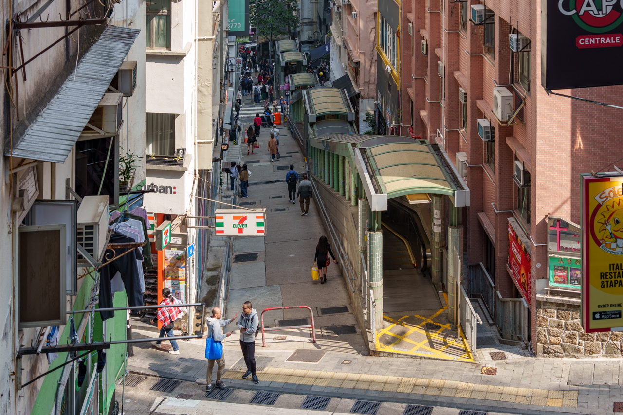 そんな中でも、訪問前から必ず見に行こうと決めていたものが、「中環半山扶手電梯」という全長800m、合計23基のエスカレーター群。街の中心部から高低差135mの高級住宅地に至る、無料の乗り物だ。労力をかけずに登坂するという機能だけでなく、多面性のある街を眺めるための移り変わる視点場としても極めて優秀。移動するだけなら合計23分とのことだが、僕は40分ほどかけてのんびり登った。進行方向は時間帯によって変わるらしく、6:00~10:00が下り、10:00~0:00が上りとのこと。そもそも住民用だもんね。帰りは横道に逸れながら、『日常の絶景』にも書いたように、高低差が生み出す試行錯誤の蓄積、水平とのせめぎ合い、巧まざる造形などをたっぷり鑑賞した。