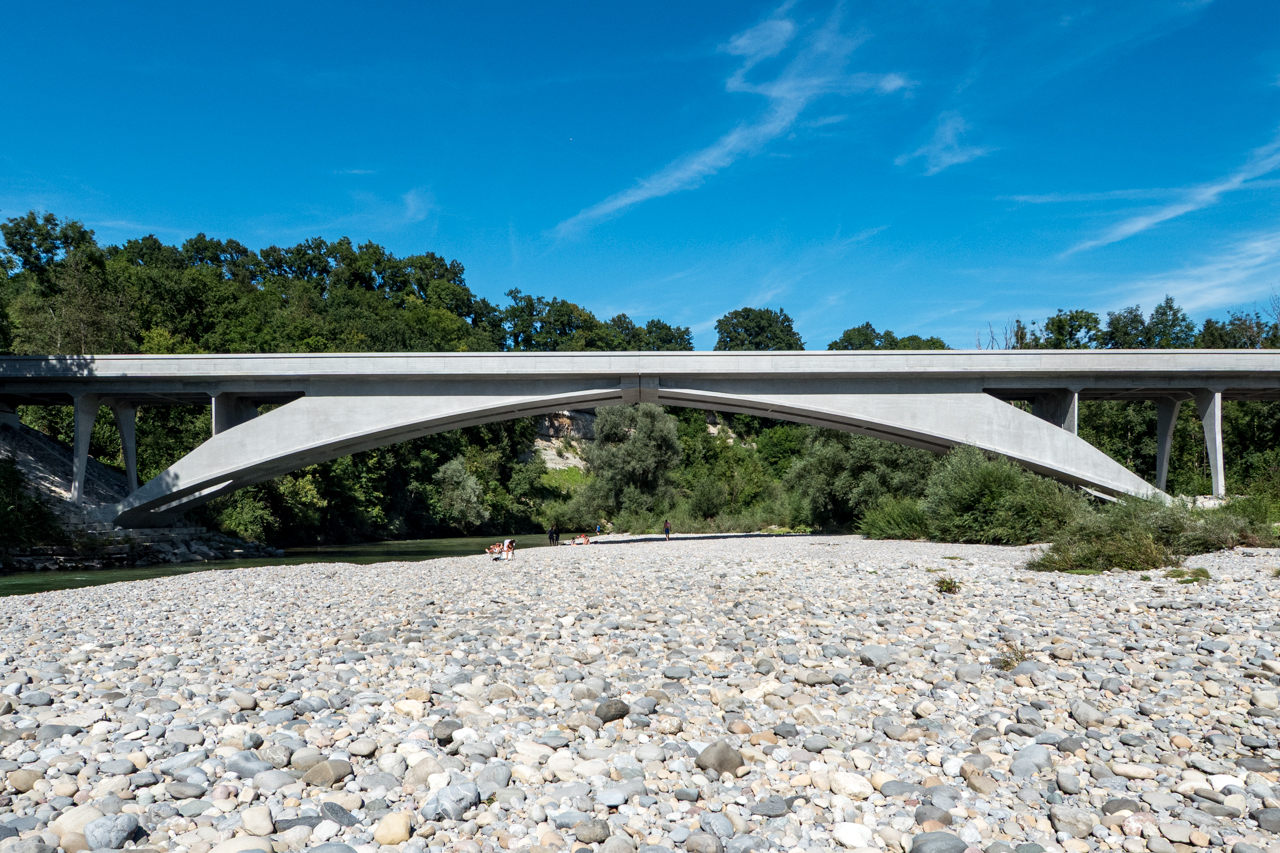 マイヤールのアーチ橋は基本的に2種類しかない。それは、サルギナトーベル橋に代表される3ヒンジアーチの群と、シュバントバッハ橋に代表される薄い板材が下から桁をサポートする補剛アーチの群。そのことを知っているつもりでいたのだが、あらためて感嘆した。もちろん架橋環境はそれぞれ異なるのに、外観のバリエーションはない。しかしよくよく眺めると、微妙な差異があることがわかる。